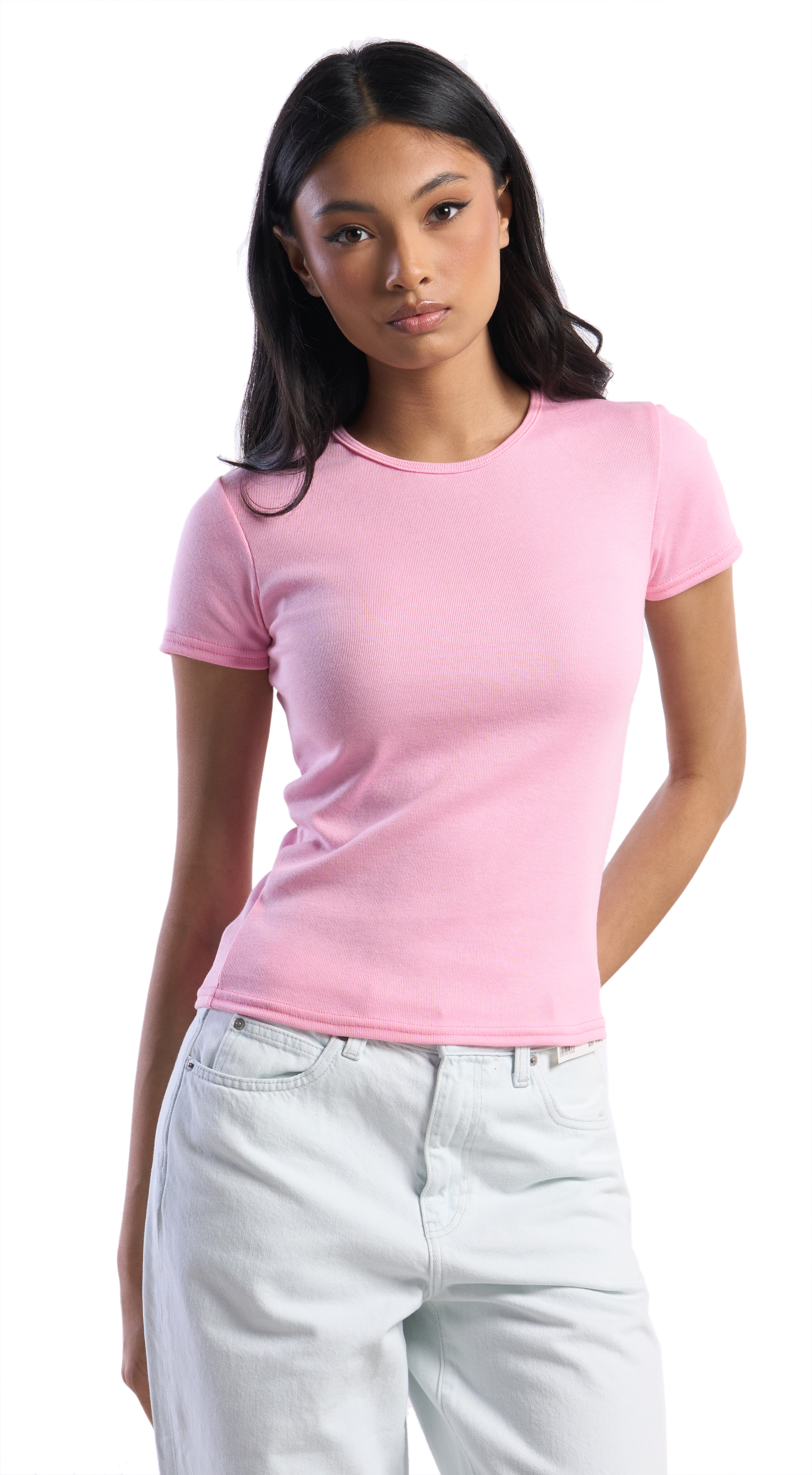 This slim-fit crewneck t-shirt is crafted from a soft 50/50 ring-spun rib knit that gently contours to the body. The fabric offers a comfortable, hug-like feel—perfectly balancing stretch and structure for an effortlessly flattering fit.